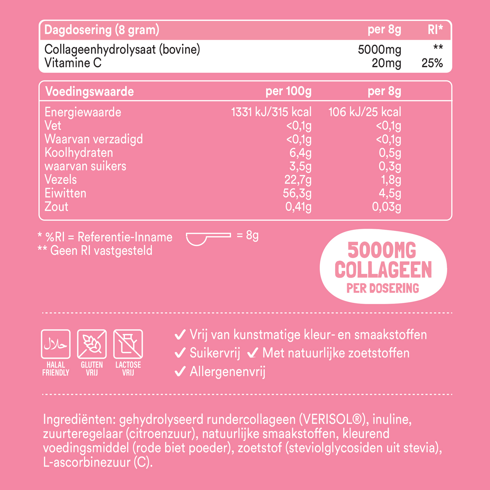 Collagen Beauty Lemonade heeft een lichtzoete bessensmaak en bevat natuurlijke zoet- en smaakstoffen, afkomstig van plantaardige bronnen. De kleurstof is gewonnen uit rode biet.